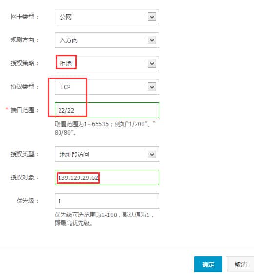 如果是针对特定端口的限制,比如屏蔽一个特定IP访问自己云服务器的22端口,授权策略选择拒绝,协议类型选择TCP,端口范围填写为22/22,授权对象填写待屏蔽的IP地址,如下:
