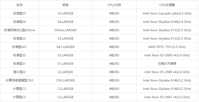 4核8G云服务器规格型号众多,如今包含:标准型S5、标准型S4、标准网络优化型SN3ne、标准型S3、标准型SA1、标准型S2、标准型S1、高IO型I2、计算数据网络增强型CN3、计算型C3、计算型C2等11款云服务器实例规格,同处理器内存下不一样规格型号的云服务器性能指标也不一样,详细完整如下表所显示: