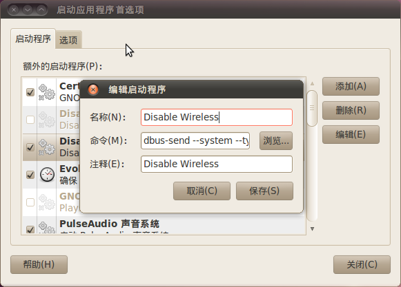将下面这条禁用无线网络的命令添加到“启动应用程序“中,这样开机时无线网络就会被自动禁用。