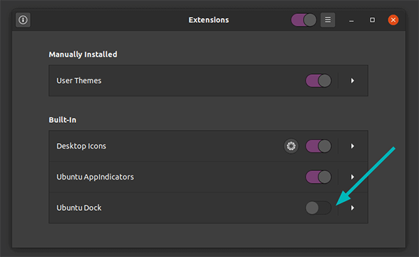 启动“扩展”应用,你应该在“内置”扩展下看到 Ubuntu Dock。你只需要关闭即可禁用坞站。