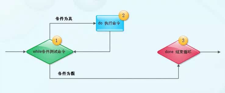 - 行1,首先进行条件测试,如果传回值为0(条件测试为真),则进入循环,执行命令区域,否则