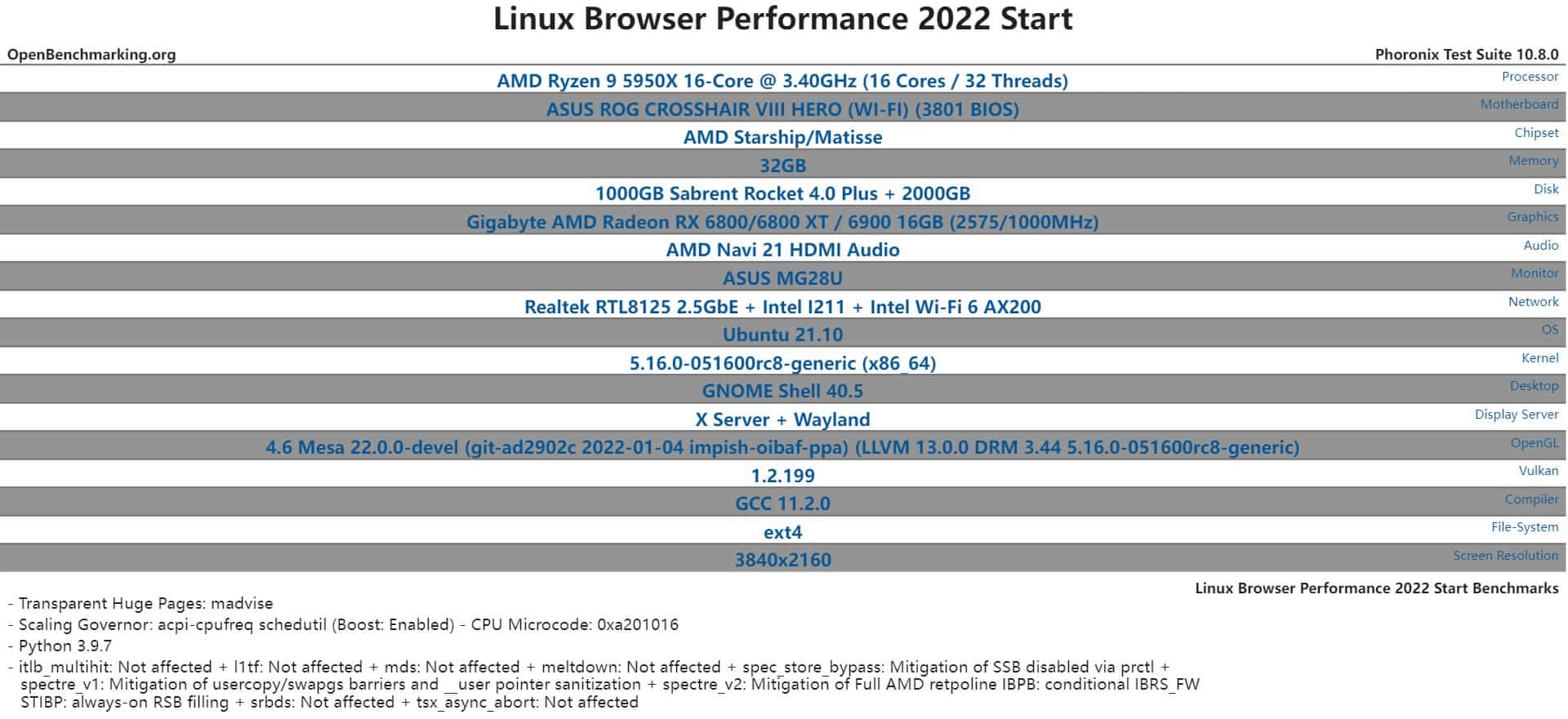 本次运行的 Benchmark 基准测试在 AMD Ryzen 9 5950X 台式机上进行,该机器使用 Radeon RX 6800 XT 显卡,并安装了最新的开源驱动程序。测试环境详细如下: