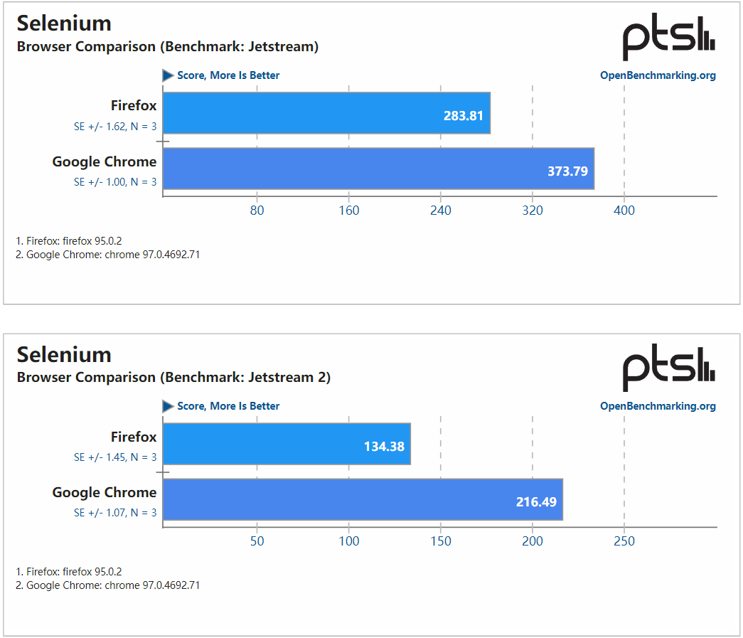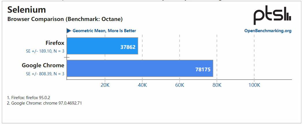 从 JetStream 测试结果可以看到,在 Linux 桌面平台上,Chrome 这方面的性能超过 Firefox。