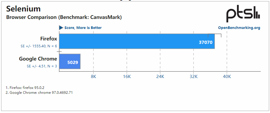 在 HTML5 CanvasMark 测试中,Firefox 体现了其强大的优势,其该项的分数是 Chrome 的 7 倍多。