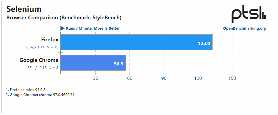 在 CSS 样式性能测试 StyleBench 中,Firefox 同样表现得十分出色,分数是 Chrome 的两倍多。