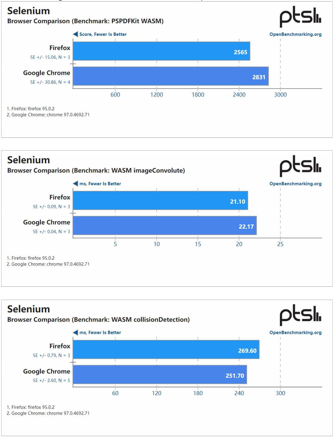 下面将要展示的 WebAssembly (WASM) 性能测试结果则体现了 Firefox 和 Chrome 在此领域的竞争局面,这样侧面印证了双方都有巨大的潜力。