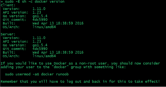 runoob@runoob:~$ wget -qo- https://get.docker.com/ | sh