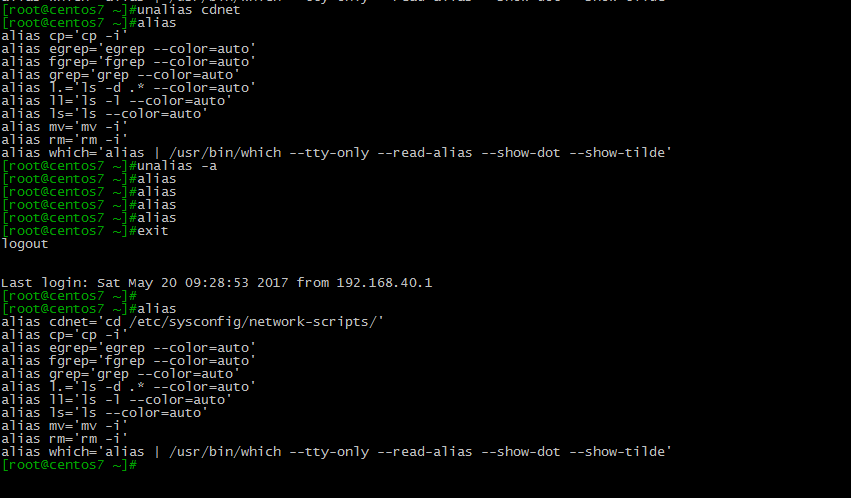 还有如果你需要取消一个别名,或者说不想要这个别名了,可以用unalias这个命令来删除,比如我们刚创的别名,我不想要了,可以输入unalias加上你想要删除的别名,unalias cdnet然后确定,这个你刚刚创的那个别名就没了,你可以在输入alias来查看,还有一个命令是删除所有别名,unalias -a这个命令就是删除所有的别名。当然这个删除肯定也只是临时删除,如果你退出了,就恢复了,如果真的想删除掉,跟刚刚创建时一样的,进入nano .bashrc这个目录,把你不想要的别名直接删掉,然后保存,在退出来就没有了。