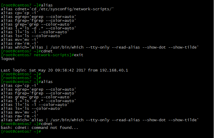 例如:我们经常用的一个文件,cd /etc/sysconfig/network-scripts/ 这个命令就特别长,如果每次要进入这个文件都要输这么长,是不是很浪费时间?那么我们可以给它定义一个别名,比如cdnet(当然这个你可以自己选择认为好记得),当然我们可以先检查一下“cdnet”这个别名或者命令有没有重复,我们定义的别名最好不要跟系统已经定义的别名和系统的一些命令起冲突,我们可以输入你要设置的名称,现在我要设置cdnet,你可以输入cdnet然后回车,看下有没有这个命令,提示说找不到这个命令,那么你就可以使用cdnet来定义这个别名,当然我们也可以输入命令“alias”,就可以看到我们已经定义了哪些别名,以后我们添加的永久别名,也会保存在这个里面。现在我们提示没有cdnet这个命令或者别名,我们就可以使用这个用alias cdnet=‘cd /etc/sysconfig/network-scripts/\’来给它建立别名,然后你在输入cdnet,跟你输入cd /etc/sysconfig/network-scripts/是完全相同的命令,这样是不是方便多了?