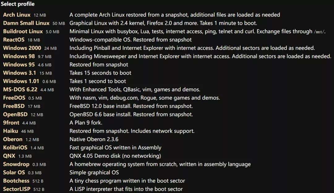 Copy.sh 是一个高效的在线 Linux 终端,能够仿真其他操作系统,包括:Arch Linux、FreeDOS、FreeBSD、OpenBSD、Windows 2000、Windows 98 等;