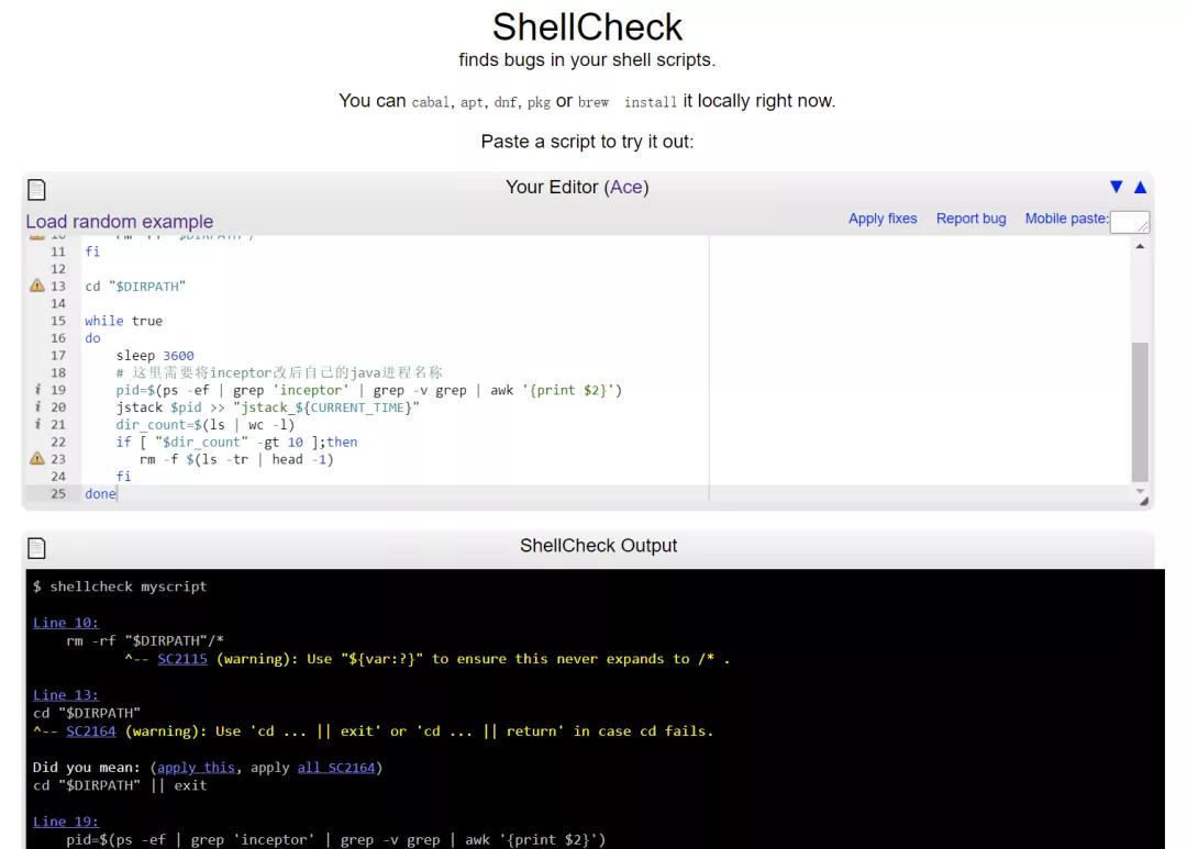 Shellcheck 是一个静态 Bash 语法检查工具,它可以在多种场景下使用,包括在线使用、命令行检查、编辑器配置。
