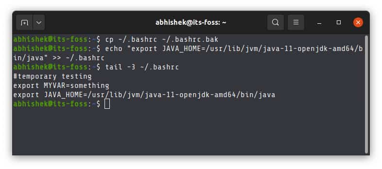 echo \"export JAVA_HOME=/usr/lib/jvm/java-11-openjdk-amd64/bin/java\" >> ~/.bashrc