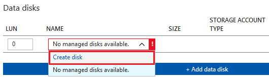 好的,终于进入正题了! 在虚机的 disks 配置中点击 \”add data disk\” 按钮开始添加磁盘,然后打开下拉列表并点击 \”create disk\” 按钮: