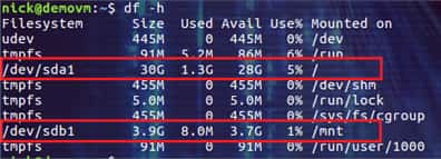临时磁盘标记为“/dev/sdb”。分区名称为 /dev/sdb1,挂载点为 /mnt。