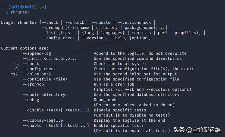 Rkhunter 或 Rootkit Hunter 与 chkrootkit 有一些相似之处。它在 Unix 系统上搜索 rootkit 和其他后门/病毒,Linux 就是一个典型的例子。相反,Rootkit Hunter 的工作方式与其对应的略有不同。最初,它检查核心和关键系统文件的 SHA-1 哈希值。此外,它将结果与其在线数据库中可用的经过验证的哈希值进行比较。该工具装备精良,可以查找任何 rootkit 目录、可疑内核模块、隐藏文件和不正确的权限。