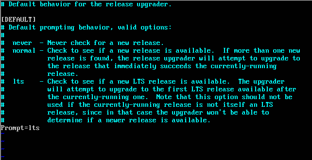 4、编辑/etc/update-manager/release-upgrades配置文件,设置prompt=lts