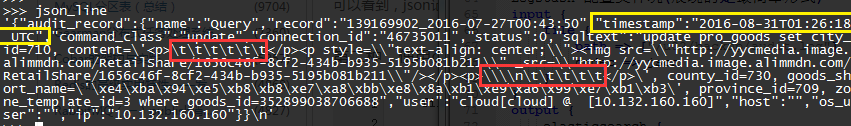 有是有过 Percona audit 插件的估计都有这样的问题,就是他记录的是时间是国际形式的(如上图黄色标记),不像我们习惯了北京时间。因此在页面显示的时间会比我们平时的少 8 小时。