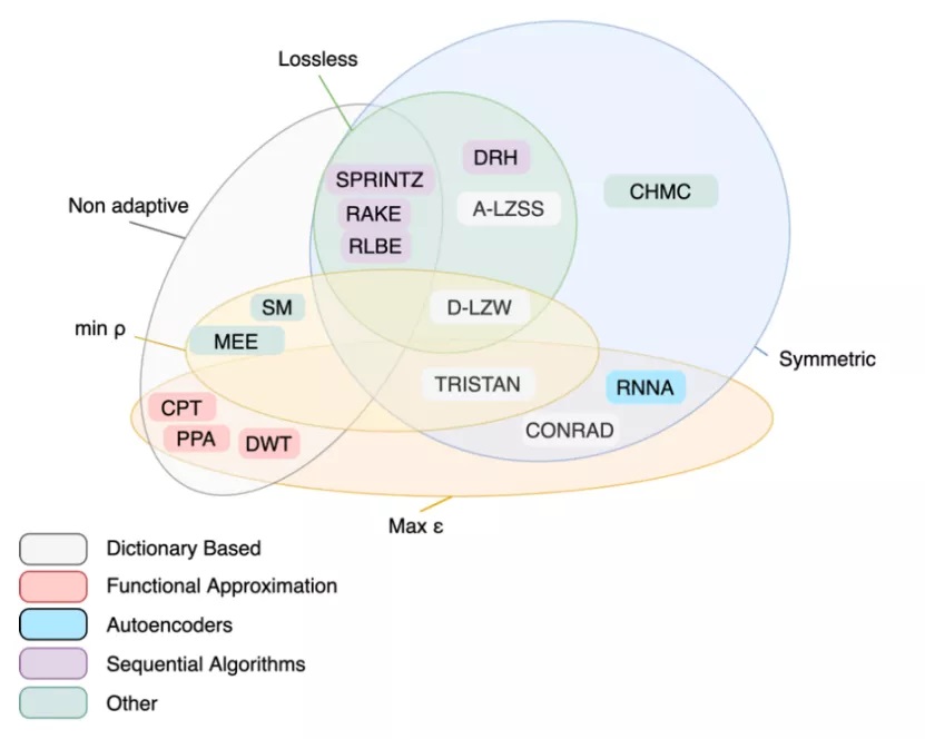 本文重点总结了时序数据库和物联网IoT传感器管理常用压缩算法,并根据技术方法(dictionary-based, functional approximation, autoencoders, sequential等)和技术属性(adaptiveness, lossless reconstruction, symmetry, tuneability)对碎片化的压缩技术进行了分类,详细参考上图,并针对主要算法性能进行了对比分析。