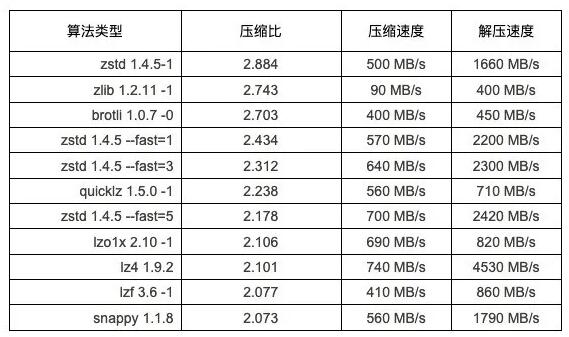 Zstandard(zstd)是一种基于Huffman编码Entropy coder实现的快速非松散DB压缩算法,字典表作为一个可选选项支撑参数控制开启关闭。算法实现由Facebook开源,支持压缩速度与压缩比之间的按需调整,能够通过牺牲压缩速度来换取更高压缩比,反之亦然。相比同类算法,zstd算法性能可参考下表数据。