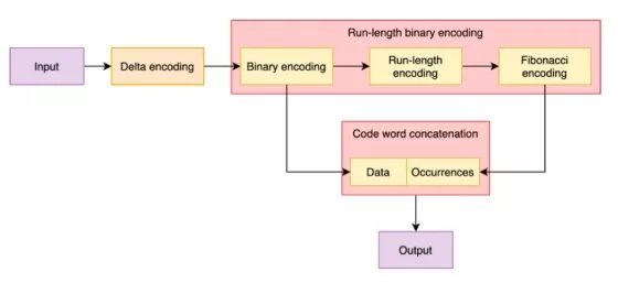 Run-Length Binary Encoding (RLBE)算法 也是一种为IoT物联网场景下数据压缩解压,适应物联网边缘端有限计算、存储资源环境的常用非松散SA时序数据压缩算法,RLBE算法融合了delta encoding,run-length encoding和Fibonacci coding三种技术,其执行过程如下图所示。