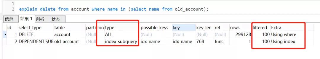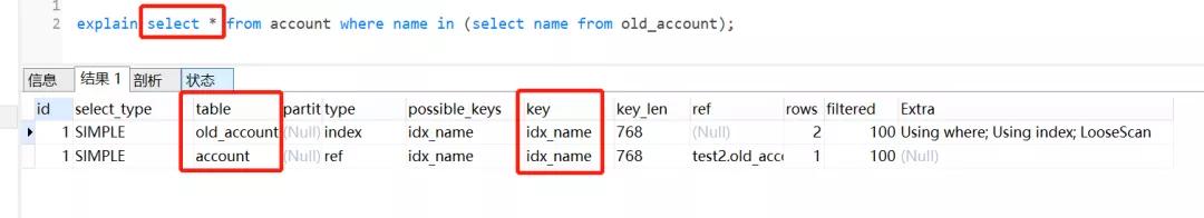 从explain结果可以发现:先全表扫描 account,然后逐行执行子查询判断条件是否满足;显然,这个执行计划和我们预期不符合,因为并没有走索引。
