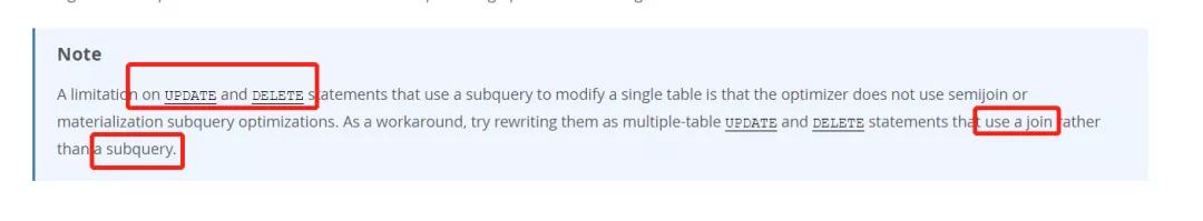 实际上,对于update或者delete子查询的语句,MySQL官网也是推荐join的方式优化
