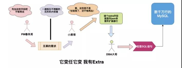 Leader大熊又给了小黑一个需求,让他存储一个数据包,数据包其实是Json的串,里面有很多字段,但是现在也不明确PM要怎么用,字段是否会调整,所以用MySQL存储的话,字段还不能确定,于是小黑加了个extra字段来存储后续的扩展,暂时解决了。