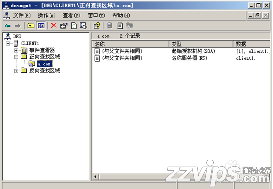 2.配置dns服务,在dns服务器上创建相应的区域a.com。