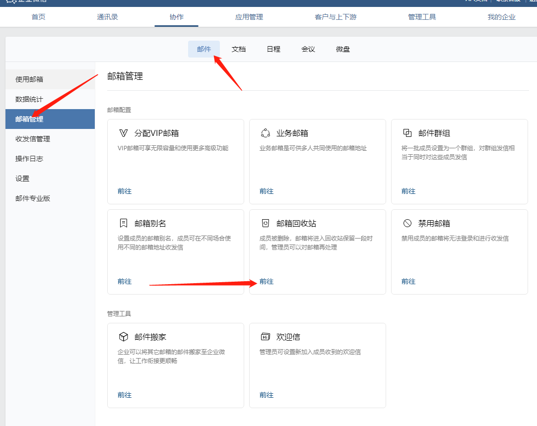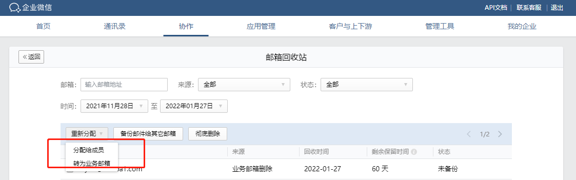 为了方便企业管理,简化管理功能,离职成员邮箱管理、待分配邮箱功能的历史数据移动至功能「邮箱回收站」下。删除成员账号、回收业务邮箱会进入邮箱回收站,管理员可通过回收站重新分配邮箱或备份邮件。