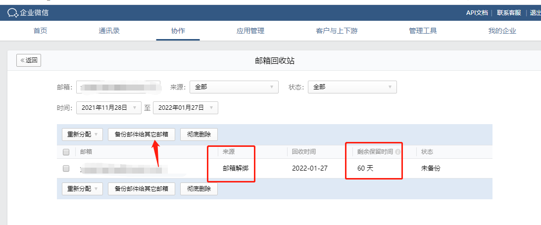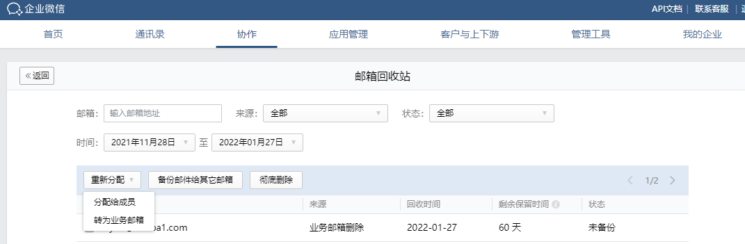 1、删除的成员邮箱至回收站保留30天、回收的业务邮箱保留60天,保留期间可以分配、备份邮件以及彻底删除操作。