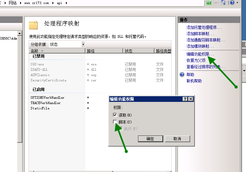1、先选择需要取消权限的目录,然后在右边可以看到“处理程序映射” 双击打开。