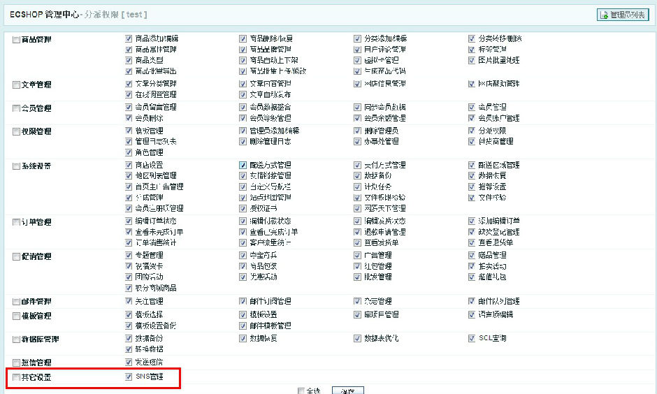 这时候,用管理员身份(admin用户)登录后台,便可看到新添加的菜单项了。因为admin的权限是“all”。如果后台有多个管理员,比如ecshop商城的供货商们,或者其它管理人员(由admin创建的其它可登陆后台的账户),如果想让他们也拥有新添加菜单的查看权利,则必须为他们分配该栏目的管理权限。
