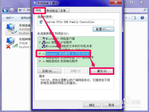 在本地连接属性窗口,选择“网络”选项卡,然后再选择“Internet协议版本 4 (TCP/IPv4)”这一项,按“属性”。