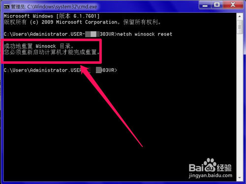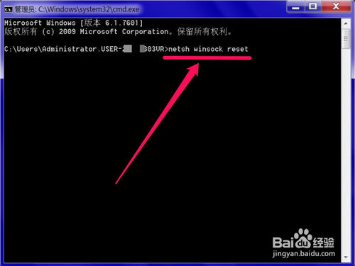 进入命令提示符窗口后,输入netsh winsock reset命令,回车,这个是重置Winsock命令。