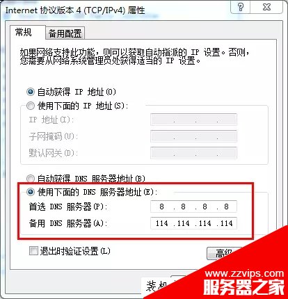 关于DNS服务器地址,我们可以设置为8.8.8.8和114.114.114.114,如上图所示。
