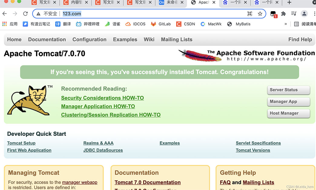 打开浏览器,在浏览器地址栏输入www.123.com,跳转到linux系统tomcat页面