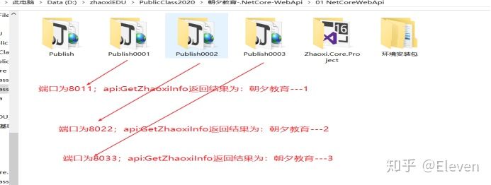 3.此时就可以使用nginx配置负载均衡了,我先启动多个webapi服务器,运行起来,每个服务器的同一个接口返回的数据略有不同;第一个服务器的接口我返回的数据为:朝夕教育—1,第二个服务器的接口返回的数据为:朝夕教育—2,第三个服务器的接口返回的数据为:朝夕教育—3;三个服务器启动后的的端口分别为:8011,8022,8033;也就是说8011端口返回的是:朝夕教育—1 ;8022端口返回的是:朝夕教育—2;8033端口返回的是:朝夕教育—3;也就是说三个服务器代码一样的,这里返回的结果不一样,是为了能够测试区别。
