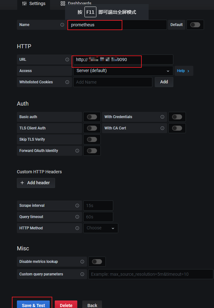 上图填写你prometheus地址,端口切记填写9090,点击save后,如果失败会有提示 。