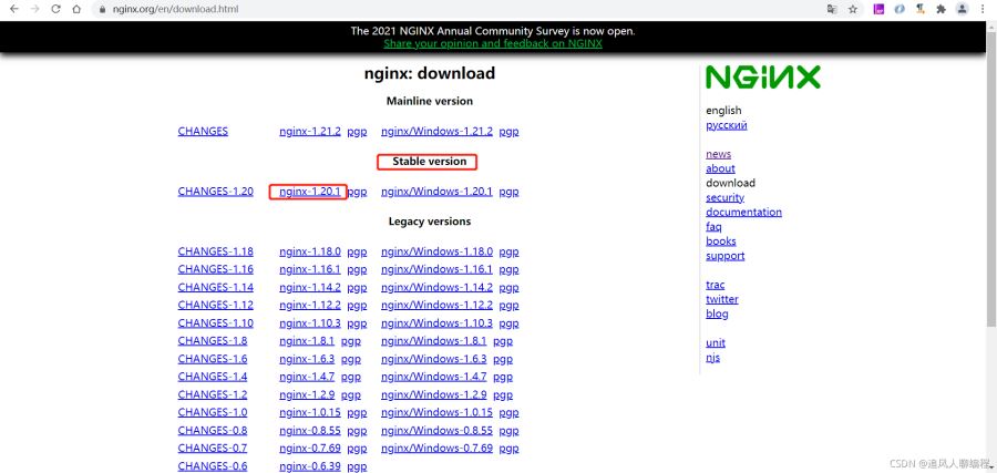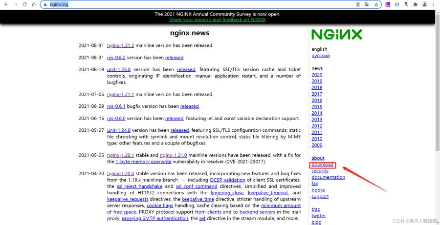 1)进入Nginx官网(https://nginx.org/),点击 download 链接