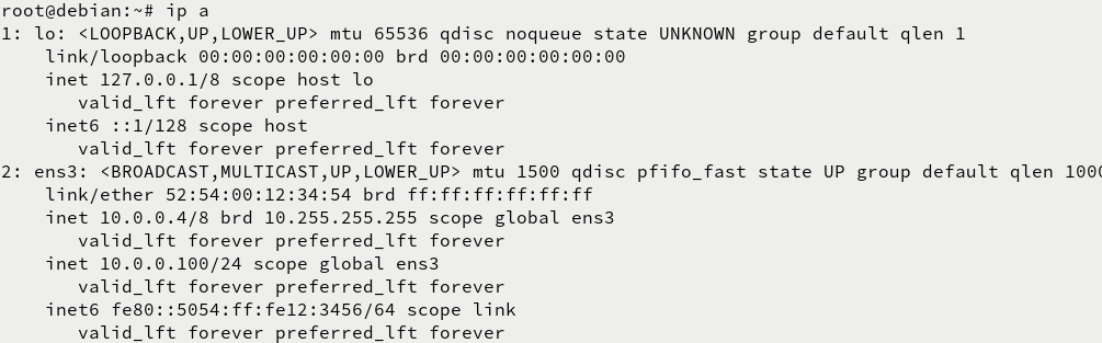 root@debian:~# ip addr del 10.0.0.8/8 dev ens3 // 删除客户机原有IP