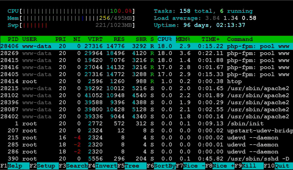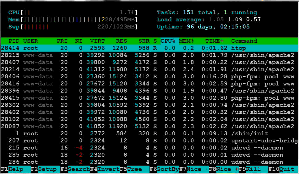 我的机器是盛大云的超微主机,平时负载cpu是1.7%,htop命令结果截图