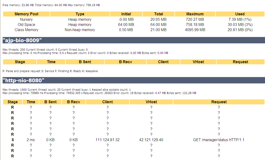 然后输入然后访问http://serverip:8080/manager/status即可访问。