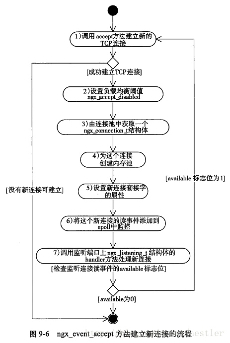 ngx_event_core_module模块的ngx_event_process_init方法对事件模块做了一些初始化。其中包括将“请求连接”这样一个读事件对应的处理方法(handler)设置为ngx_event_accept函数,并将此事件添加到epoll模块中。当有新连接事件发生时,ngx_event_accept就会被调用。大致流程是这样: