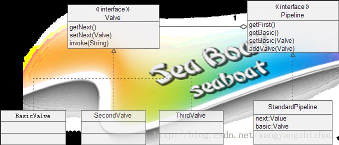既然管道模式这么有用,我们希望能在程序中适当地考虑使用,为了实现此模式需要多个对象协作,可参考如下类图,valve接口定义了阀门的调用方法,由于阀门与阀门使用单链表结构连接所以需提供对next的操作,实现一个阀门对其进行扩展即可;pipeline接口定义了管道操作阀门的方法,包括获取第一个阀门、获取基础阀门、添加阀门等方法,管道需对其扩展。