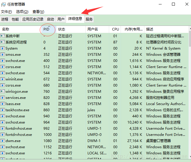 在选项卡中选择详细信息,然后点击pid排序,再找到需要终止的进程号,右键选择结束任务即可