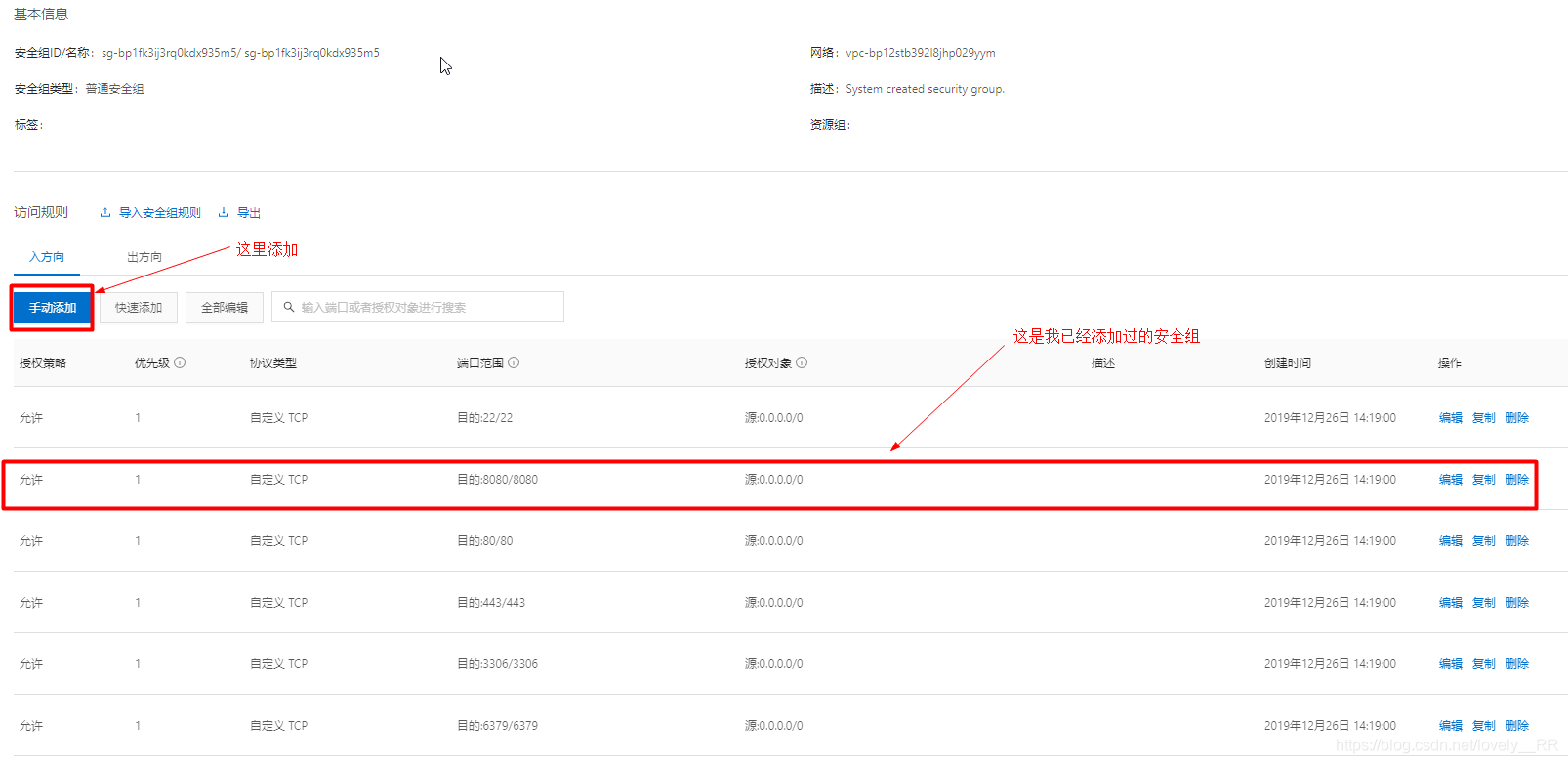 这里需要注意最好是将8080端口的入方向以及出方向都配置好,这样安全组我们就也已经配置好了.