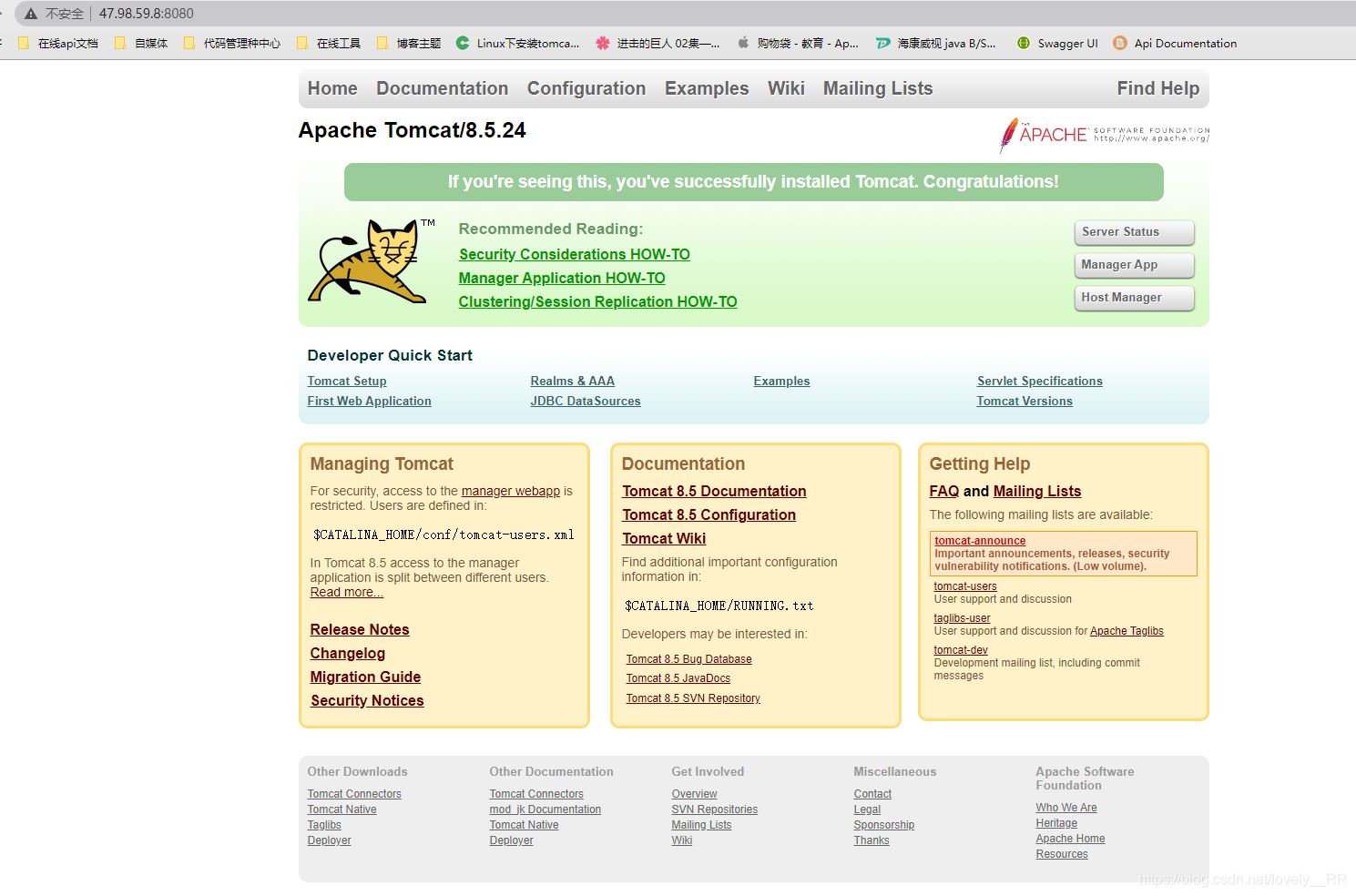这时候如果你的端口都不冲突的话,那么你就能你访问 阿里云ip:8080,应该就能看到Tomcat的页面了,但是如果没有看到,基本就说明端口冲突了,这时候我们就需要去检查端口,看看是哪个端口冲突了,这时候我们需要去查看日志,一般是在这样的路径下