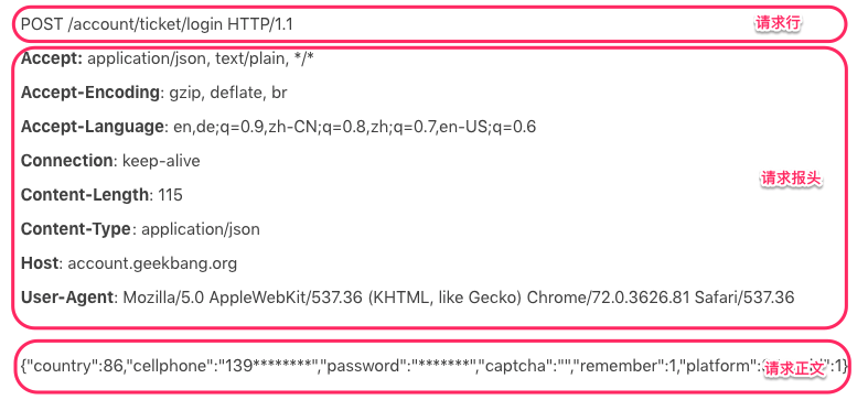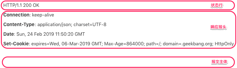 http 的响应也是由三部分组成,分别是状态行、响应报头、报文主体。同样,我还以极客时间登陆请求的响应为例。