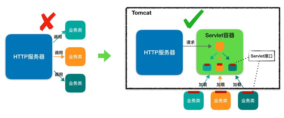 那该怎么解决这个问题呢?我们知道,面向接口编程是解决耦合问题的法宝,于是有一伙人就定义了一个接口,各种业务类都必须实现这个接口,这个接口就叫 servlet 接口,有时我们也把实现了 servlet 接口的业务类叫作 servlet。