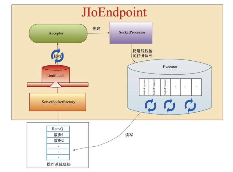 需要额外说明的是,当到达最大连接数时(已经limitlatch组件最大值,acceptor组件阻塞了),操作系统底层还是会继续接收客户端连接,并将请求放入一个队列中(backlog队列)。这个队列是有一个默认长度的,默认值是100。当然,这个值可以通过server.xml的connector节点的acceptcount属性配置。假如在短时间内,有大量请求过来,连backlog队列都放满了,那么操作系统将拒绝接收后续的连接,返回“connection refused”。